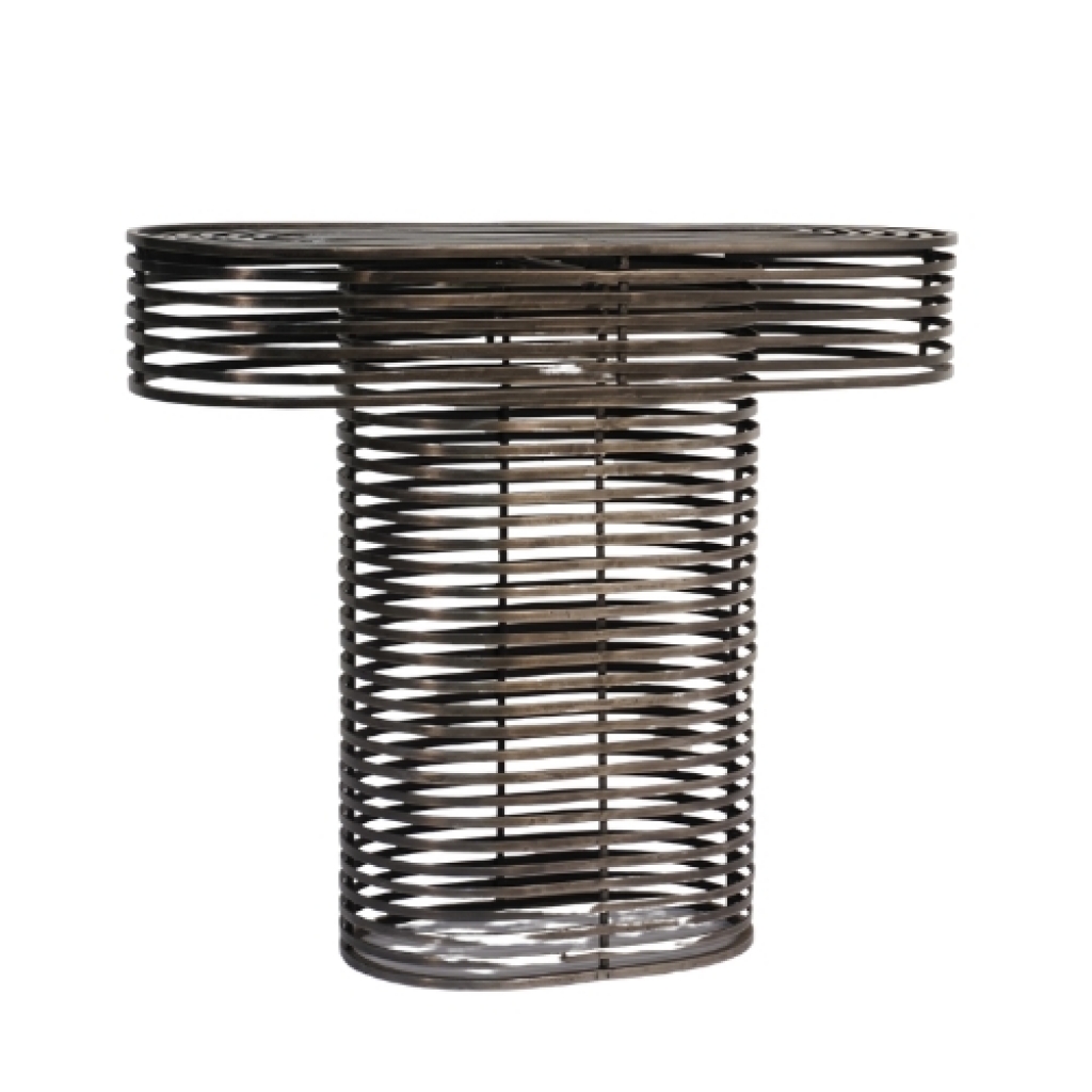 Ref: M26201-7710-228 0Aparador oval de ferro, intitulado *Orbilate* por seu design de aneis paralelos que lembram orbitas, na cor cinza banhado.