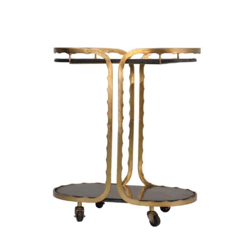 Ref: M26204-1001-311 0Carrinho de servir de ferro forjado com rodizios, com design oval e tampos de marmore preto, intitulado *Ondina* inspirado em suas ondulacoes, na cor bronze banhado.