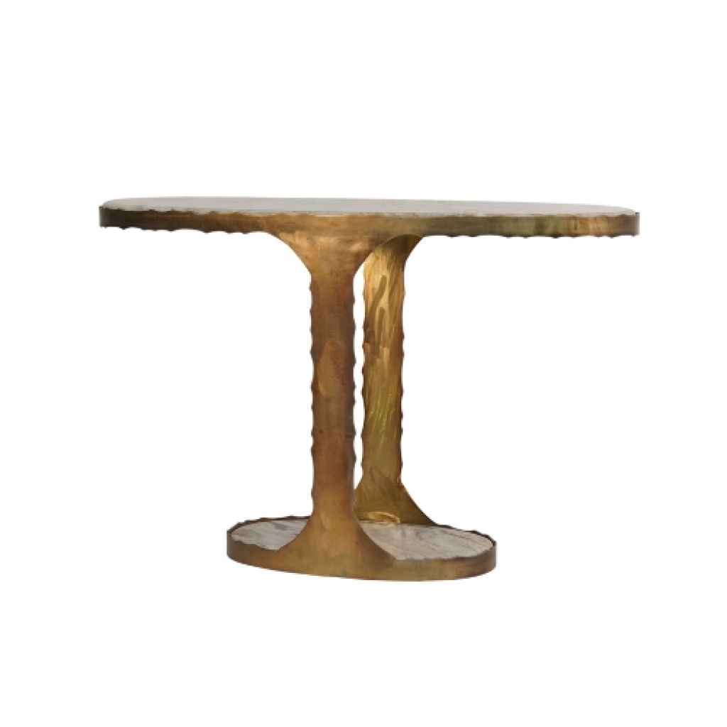Ref: M26204-7710-391 0Aparador de ferro forjado, com design oval e tampos de marmore fantasia marrom, intitulado *Ondina* inspirado em suas ondulacoes, na cor bronze banhado.