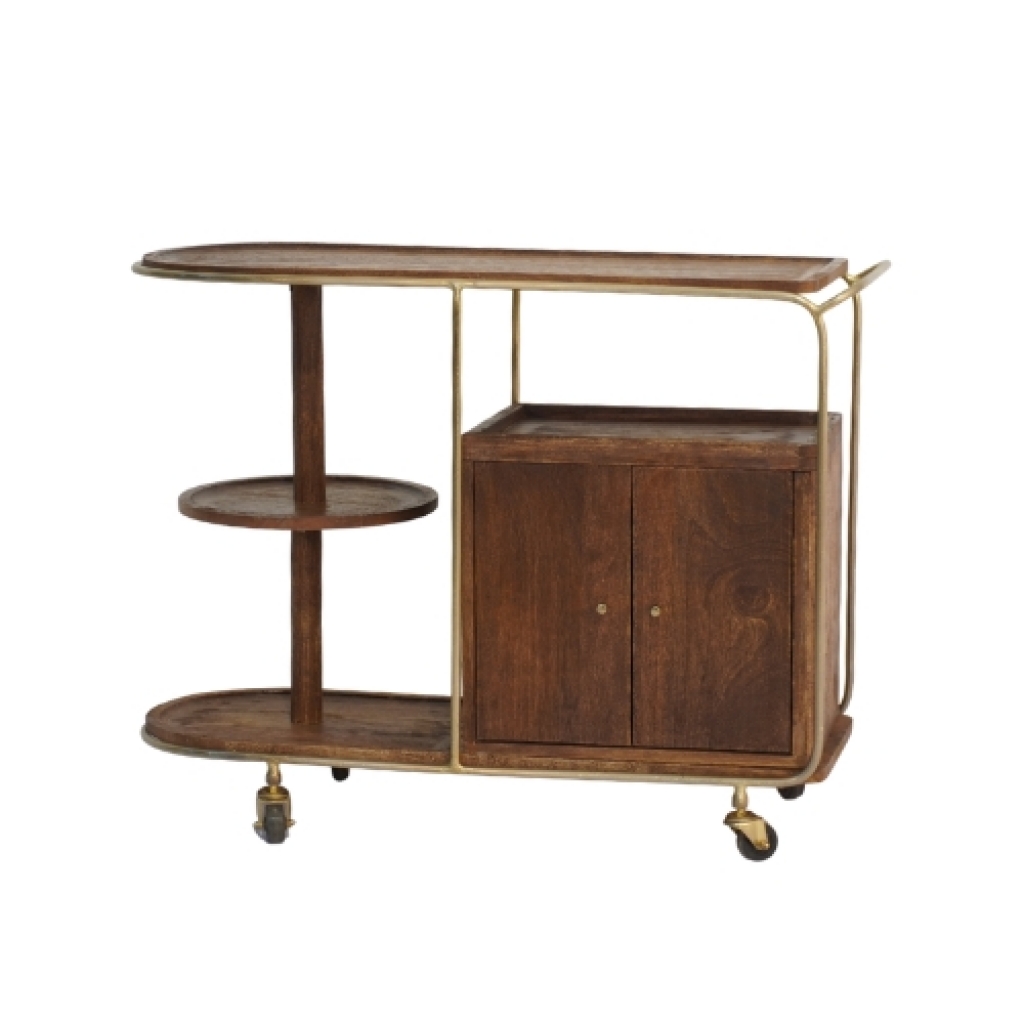 Ref: M26206-1001-883 0Carrinho de servir retro, com armario e tampo de bandeja de madeira e estrutura de ferro com rodizios, intitulado *Savoy* em referencia a hoteis e clubes luxuosos do inicio do seculo XX, na cor marrom e dourado banhado.