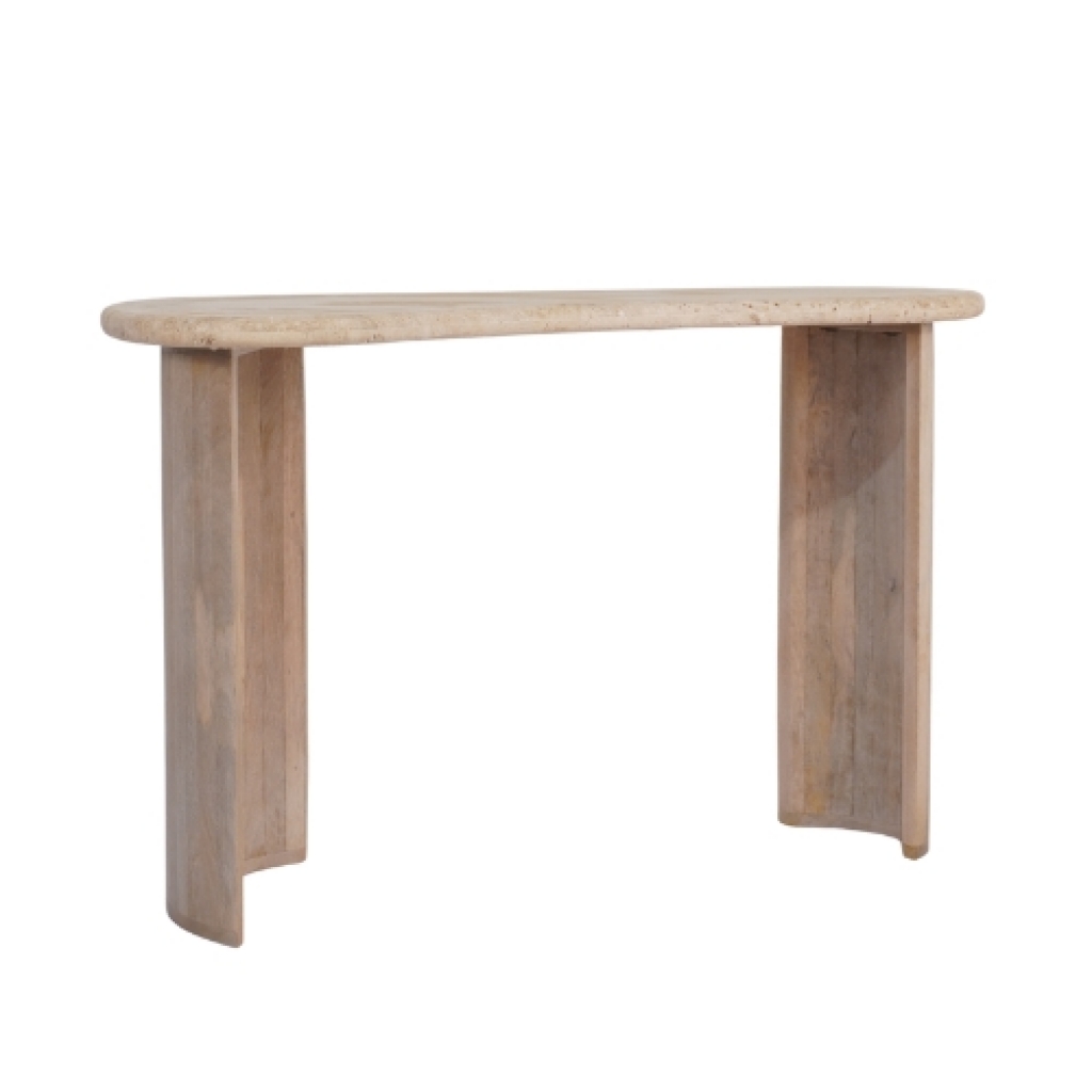 Ref: M26303-0770-811 0"Aparador curvo em ""L"" de canto, design de madeira com tampo em pedra travertino italiano, intitulado *Alvura* remetendo a sua tonalidade de clareza luminosa e pura, na cor bege."