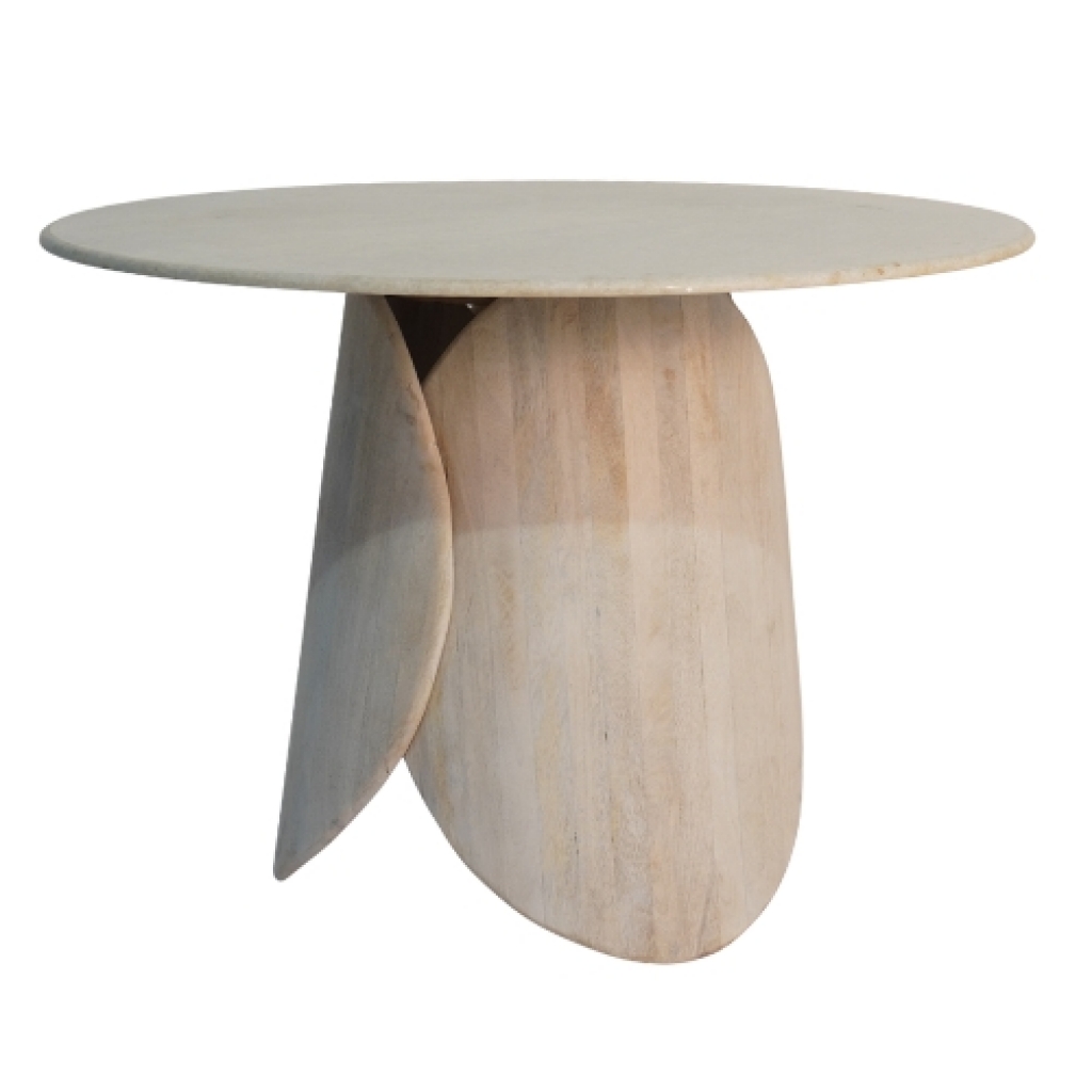 Ref: M26303-4310-811 0Mesa hall com base de madeira, em detalhe de camadas sobrepostas e tampo de marmore branco, intitulado *Alvura* remetendo a sua tonalidade de clareza luminosa e pura, na cor bege.