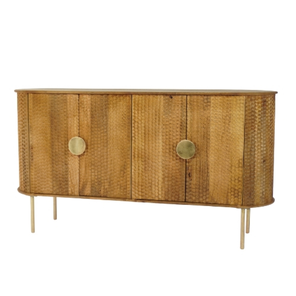 Ref: M26305-6670-810 0Buffet de madeira com 4 portas e puxadores dourados banhados com formato de disco, intitulado *Fore* que significa criar cavidades ou entalhes em uma superfície, em referencia ao seu design com acabamento martelado, na cor natural.