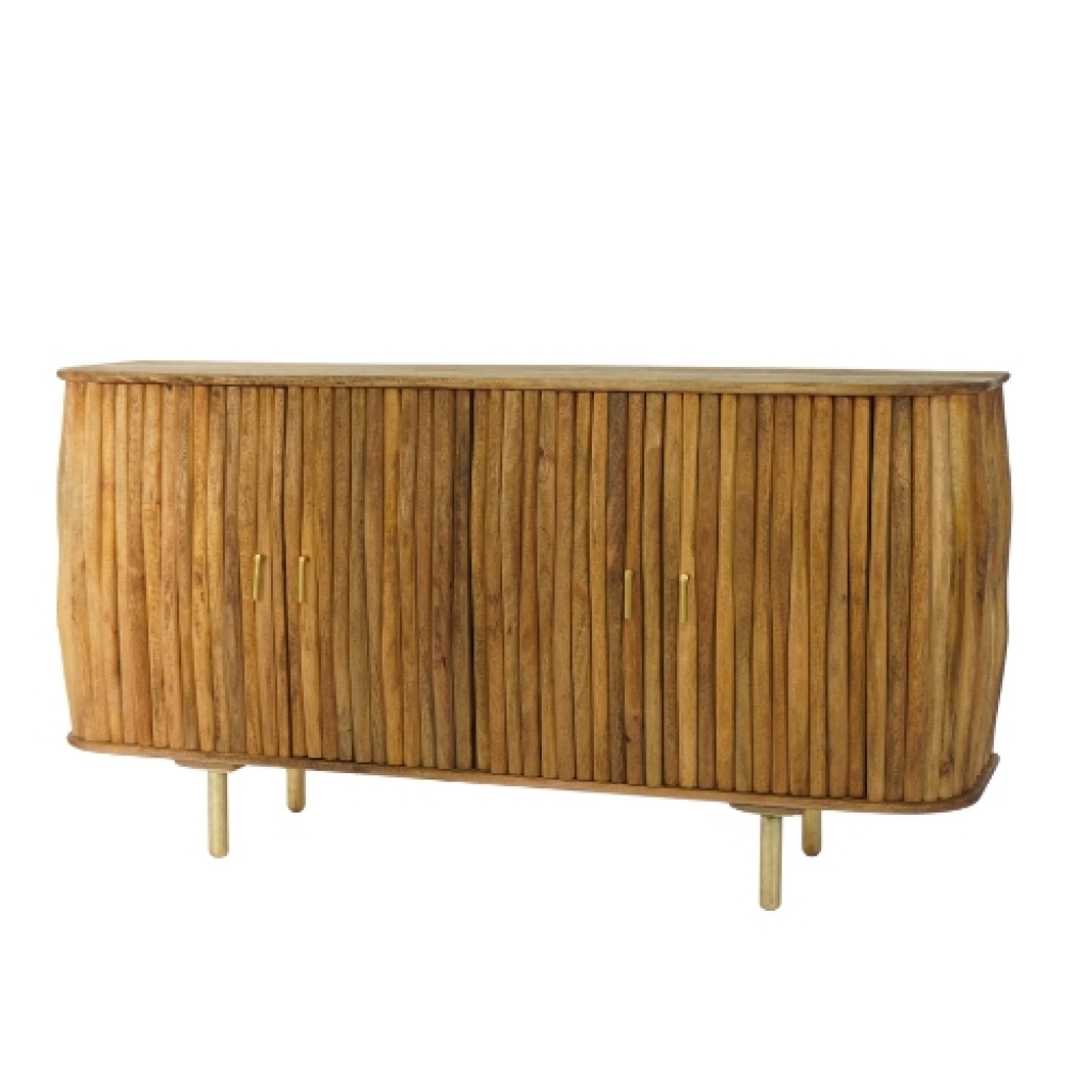 Ref: M26310-6670-811 0Buffet de madeira com 4 portas e puxadores dourados banhados, intitulado *Ripia*, em referencia ao seu design com tracos visuais e tateis de ripas verticais, na cor natural.