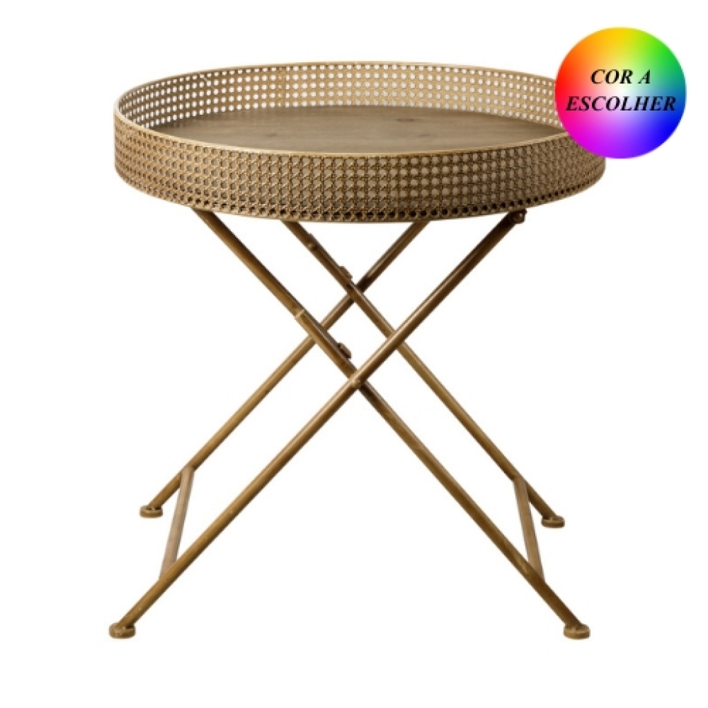 Ref: M12201-1183-999 0Mesa lateral ou Auxiliar, no tamanho maior, com o tampo no formato redondo a maneira de Bandeja, como se fosse de Palhinha, por isso intitulada *Faux Palhinha* sobre base de metal que dobra.