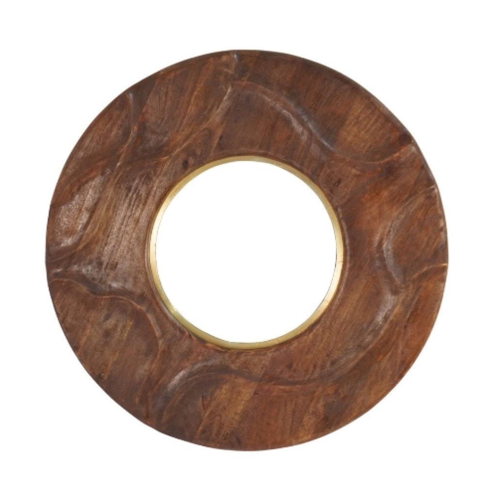 Ref: O26300-1190-800 0Espelho redondo com moldura de madeira, intitulado *Barroca*, seu design esculpido que remete ao estilo artistico com curvas e relevos, na cor marrom.