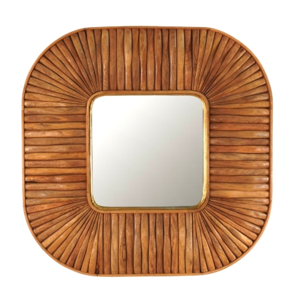 Ref: O26310-3180-811 0Espelho quadrado com moldura arredondada de madeira, intitulado *Ripia*, em referencia ao seu design com traços visuais e tateis de ripas verticais, na cor natural.