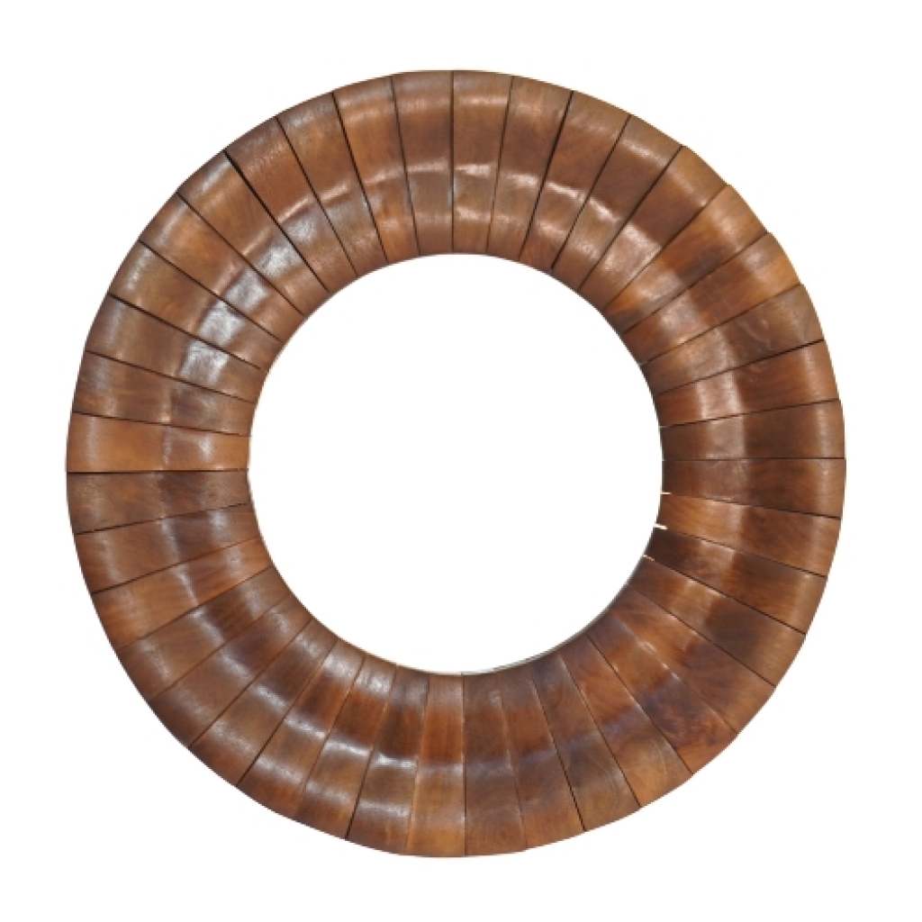 Ref: O26314-1190-880 0Espelho redondo com moldura de madeira, intitulado *Solene*, esculpido de forma que faz referencia aos raios de sol partindo do centro, na cor marrom.