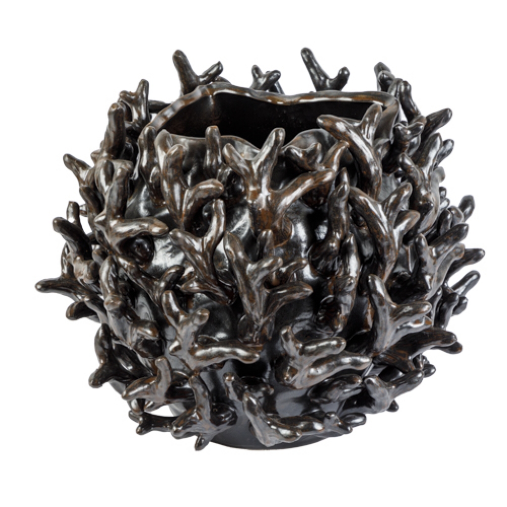Ref: C30A05-880-1274 0Vaso de ceramica, intitulado *Cervus*, por suas formas organicas e ramificadas lembrando galhos e chifres, remete as folhas da planta Chifre-de-veado, na cor marrom escuro.
