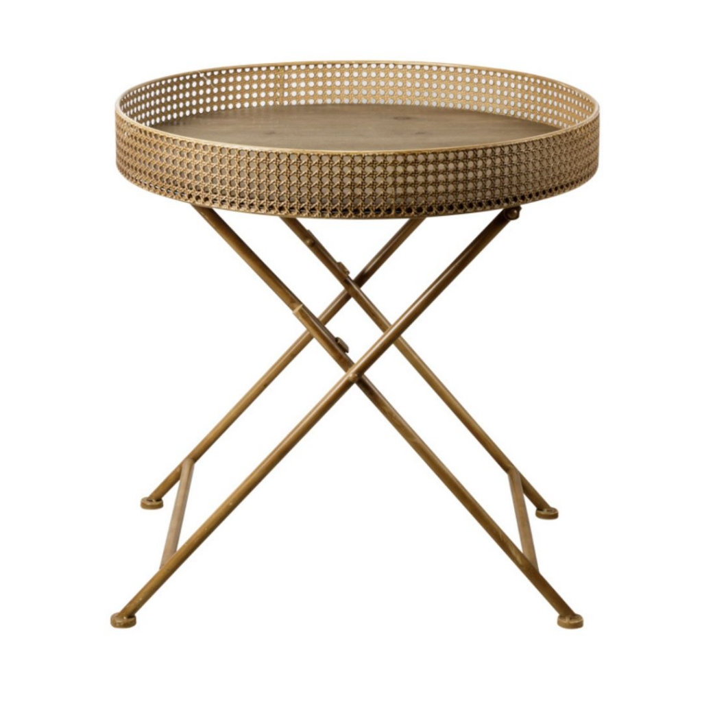 Ref: M12201-1183-389 0Mesa lateral ou Auxiliar, no tamanho maior, com o tampo no formato redondo a maneira de Bandeja, como se fosse de Palhinha, por isso intitulada *Faux Palhinha* sobre base de metal que dobra.