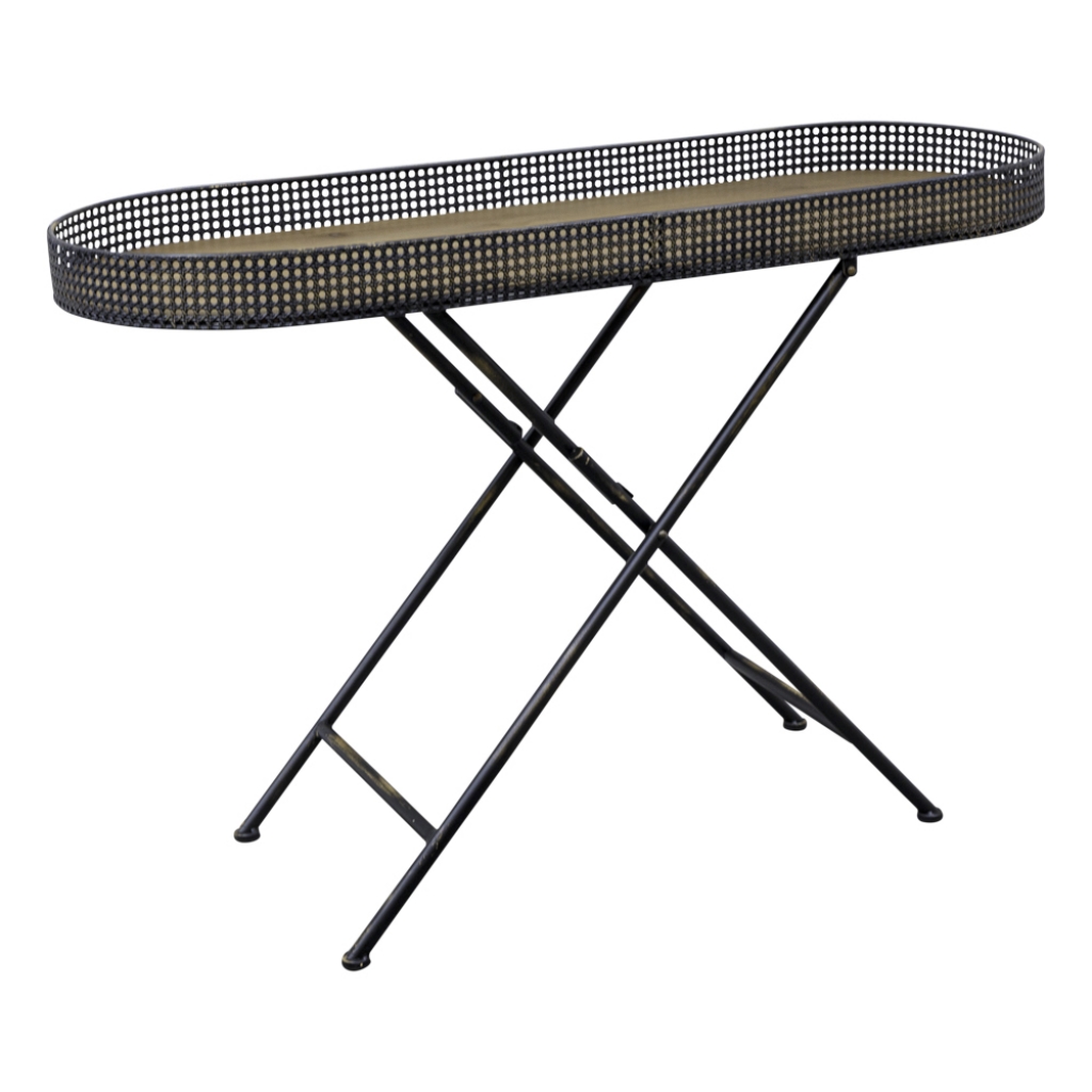 Ref: M12201-1185-181 0Aparador, ou Mesa Auxiliar, sobre base de metal que dobra , como se fosse de Palhinha, por isso intitulada *Faux Palhinha*com tampo a maneira de Bandeja , no formato Oval com patina preta