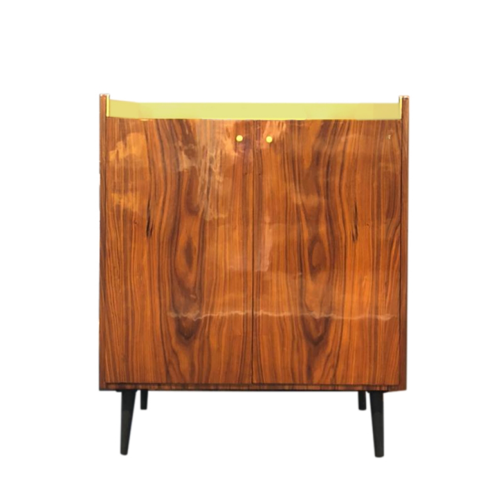 Ref: M40261-6008-880 0Comoda de madeira revestida com folha madeira, com duas portas, acabamento em latao, intitulada *Pau Ferro*.