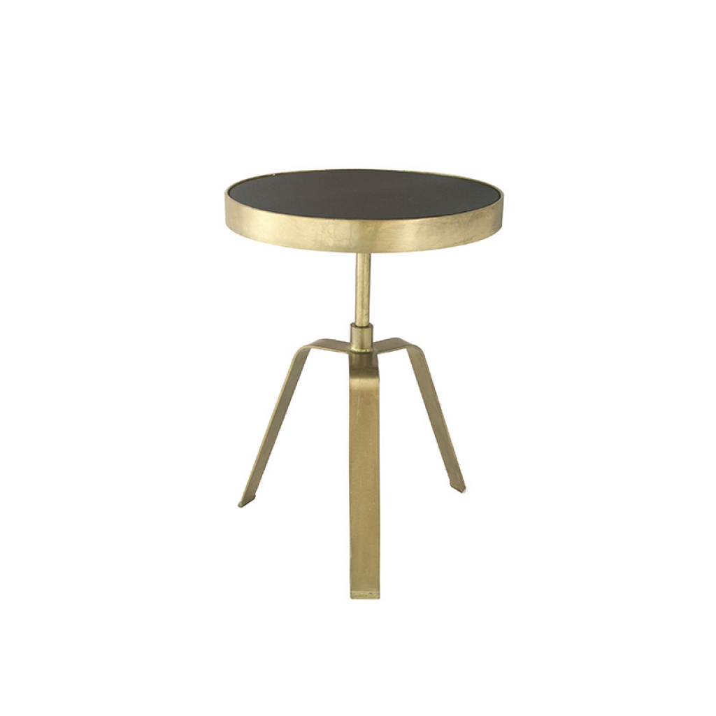 Ref: 93173 0Mesa lateral ou auxiliar de metal de formato redondo na cor dourada e envelhecida, com base tripe e tampo de granito preto, intitulada *Contemporain*.