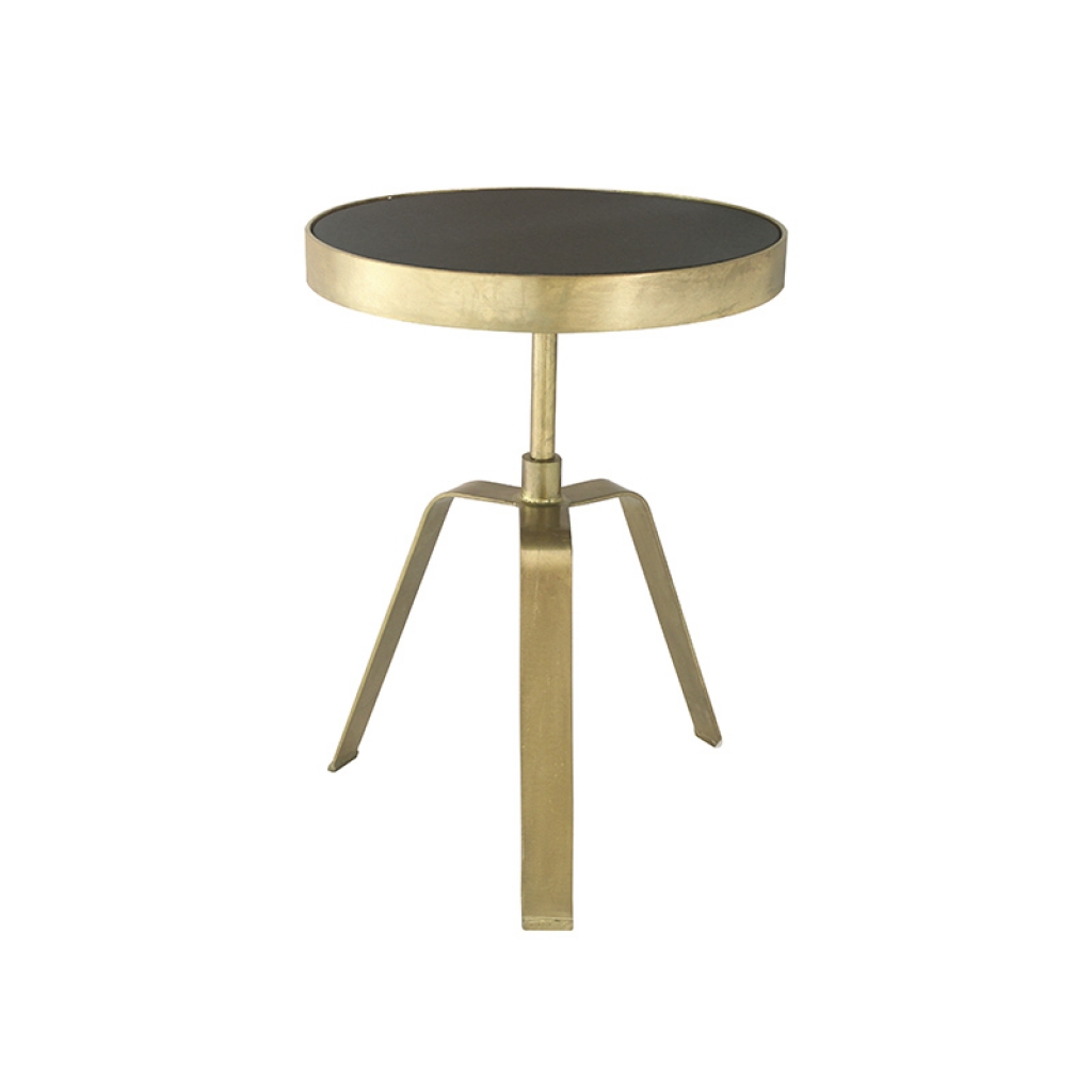 Ref: 93174 0Grande mesa lateral ou auxiliar de metal de formato redondo na cor dourada e envelhecida, com base tripe e tampo de granito preto, intitulada *Contemporain*.