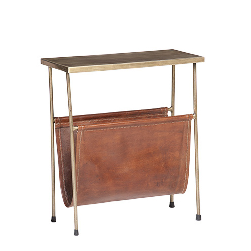 Ref: 96009 0Mesa lateral ou auxiliar de metal, de formato retangular, com revisteira de couro.