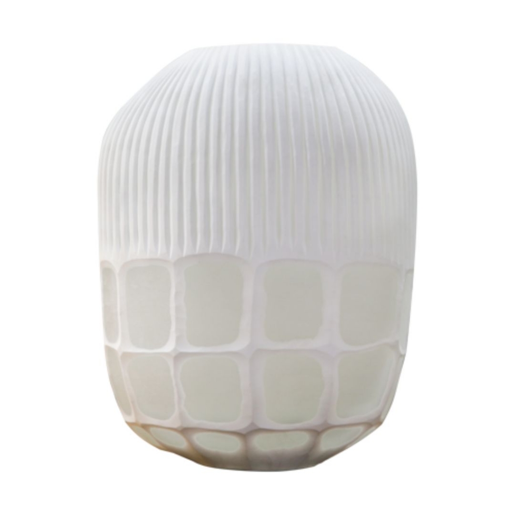 Ref: K30A04-009-1241 0Grande vaso de vidro, ovalado branco base com textura quadradinhos e em cima ripado, tamanho 31,5x23 diam, altura 40cm.