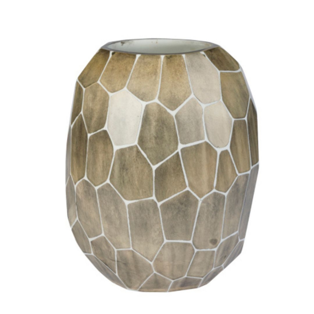 Ref: K33A04-007-1243 0Grande vaso de vidro oval, escamizado na cor dourada, tamanho 21,5x18x27cm diam, 27cm alt