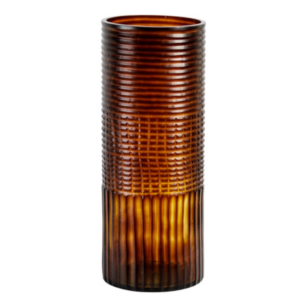 Ref: K38A03-006-1098 0Vaso alto tubular de vidro, medida 17,5x45,5cm, na cor ambar e detalhes marrons