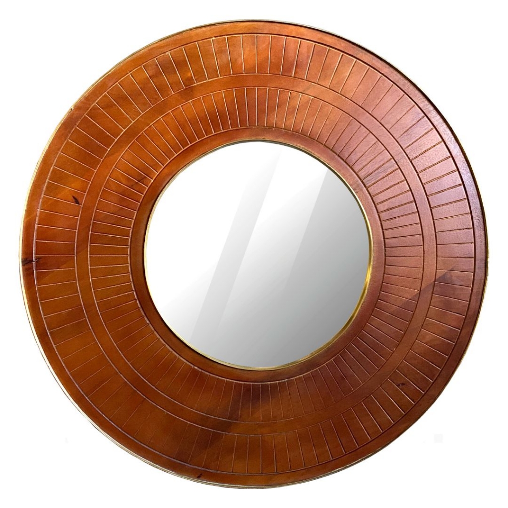 Ref: O40251-0556-803 0Espelho redondo em moldura entalhada com borda revestida em tom de madeira.