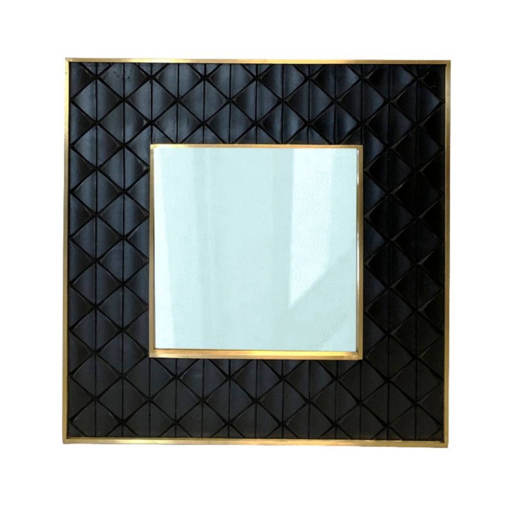 Ref: O40263-4617-100 0Espelho quadrado intitulado *Diamond* em madeira lustrada natural com marcheterie e filete de metal.