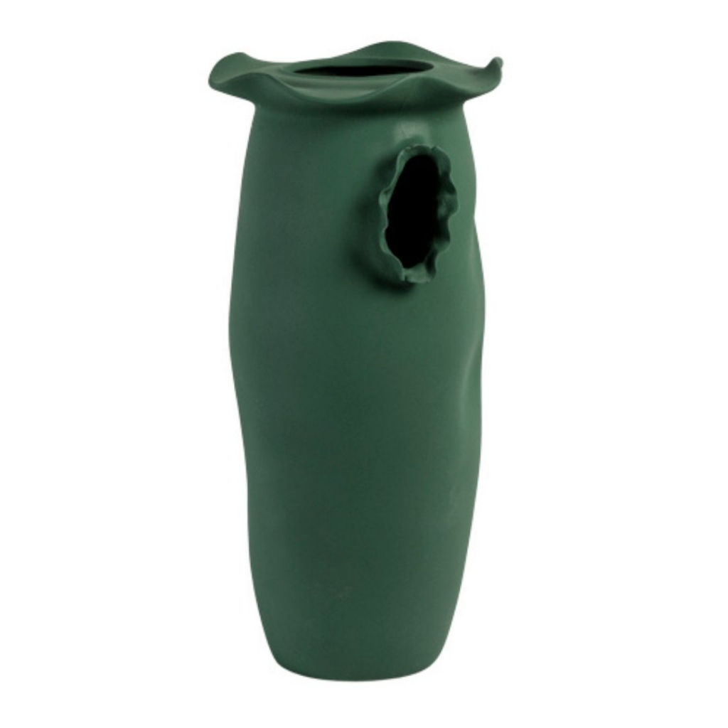 Ref: C56A01-226-2152 0Vaso alto de ceramica chinesa trabalhada a mao, com a borda irregular, com recortes e grande furo na parte principal, na cor Verde Escuro, intitulado *Atlas Vert Fonce*.