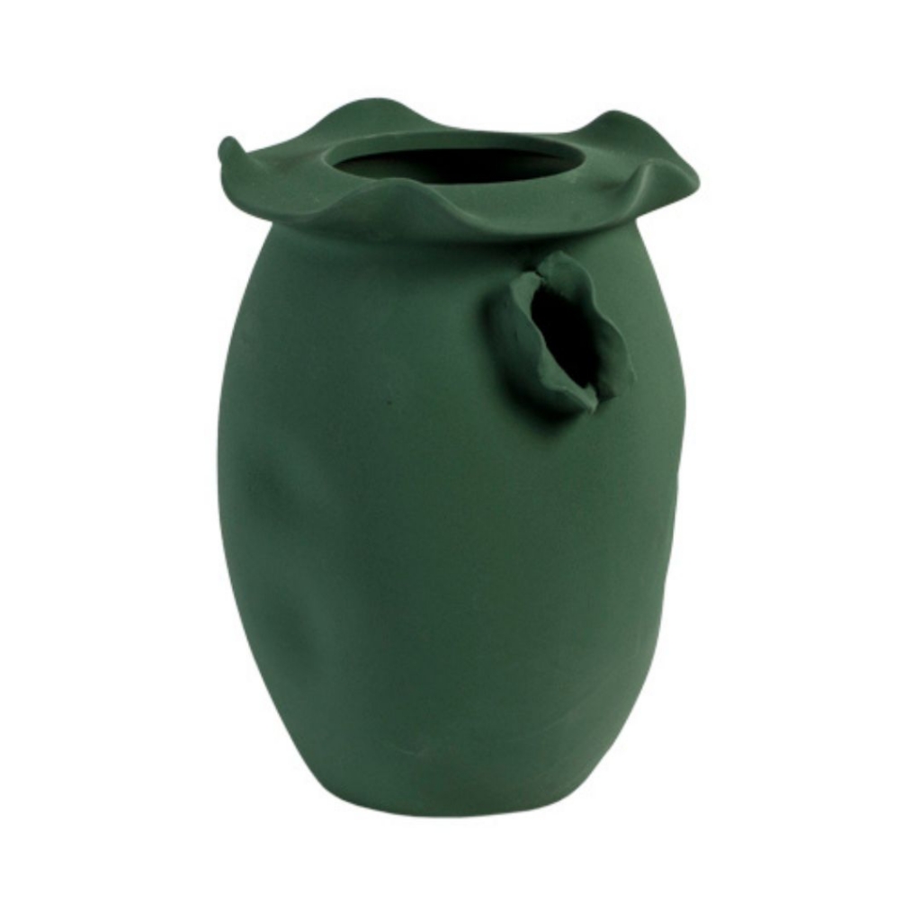 Ref: C56A01-226-2154 0Vaso de ceramica chinesa trabalhada a mao, com formato mais bojudo, a borda irregular , com recortes e grande furo, na cor Verde Escuro, intitulado *Atlas Vert Fonce*.