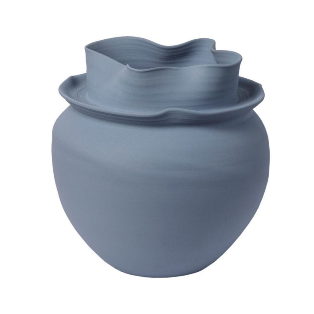 Ref: C57A01-220-2151 VasoCachepo de ceramica chinesa trabalhada a mao, com a borda irregular e com recortes, na cor Azul claro, intitulado *Atlas Cielo* porque tem seu formato inspirado no trabalho dos artesaos Berbers, do Marrocos e com a cor Azul tentando remeter a cor do