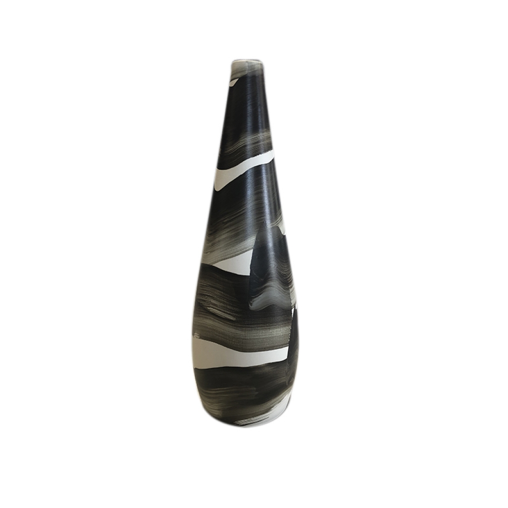 Ref: C71A02-170-1650 0Vaso com boca estreita de ceramica com fundo branco e decoração pincelada na cores preta e roxa, intitulado *Tiga*.