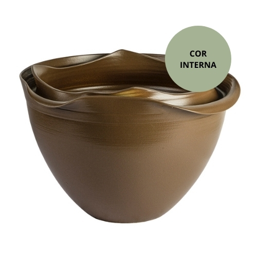Ref: C46A05-860-1280 0Cachepot de ceramica, formato de bordas onduladas e camadas que lembram a sobreposicao de petalas abertas, intitulado *Lotus* sendo um dos simbolos mais fortes da cultura chinesa, colecao Essencia do Oriente na cor marrom rustico e verde brilhoso.