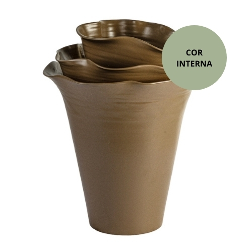 Ref: C46A05-860-1281 0Vaso de ceramica, possui formato de bordas onduladas e camadas que lembram a sobreposicao de petalas abertas, intitulado *Lotus* sendo um dos simbolos mais fortes da cultura chinesa, colecao Essencia do Oriente na cor marrom rustico e verde brilhoso.