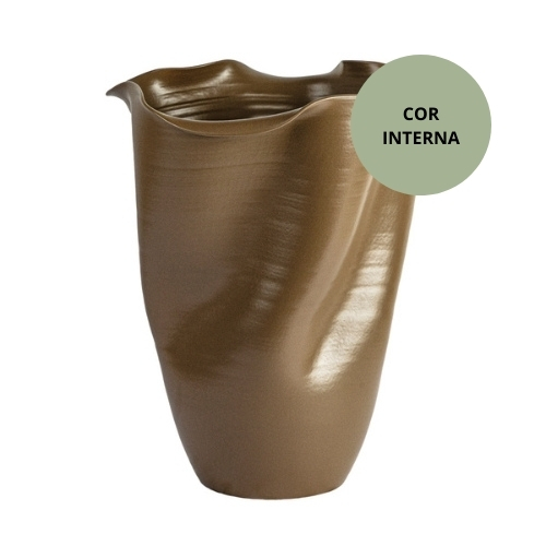 Ref: C46A05-860-1285 0Grande vaso de ceramica, formato de bordas onduladas e curvas que lembram ondas das aguas, intitulado *Chang* em homenagem ao rio Changjiang, que é o “Rio Longo”, o maior da China, colecao Essencia do Oriente na cor marrom rustico e verde brilhoso.