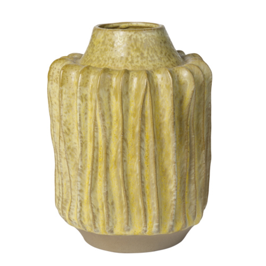 Ref: C10A04-580-1114 0Vaso medio rustico, com ranhuras em alto relevo, de bocal curto e liso sem detalhes, na cor amarelo