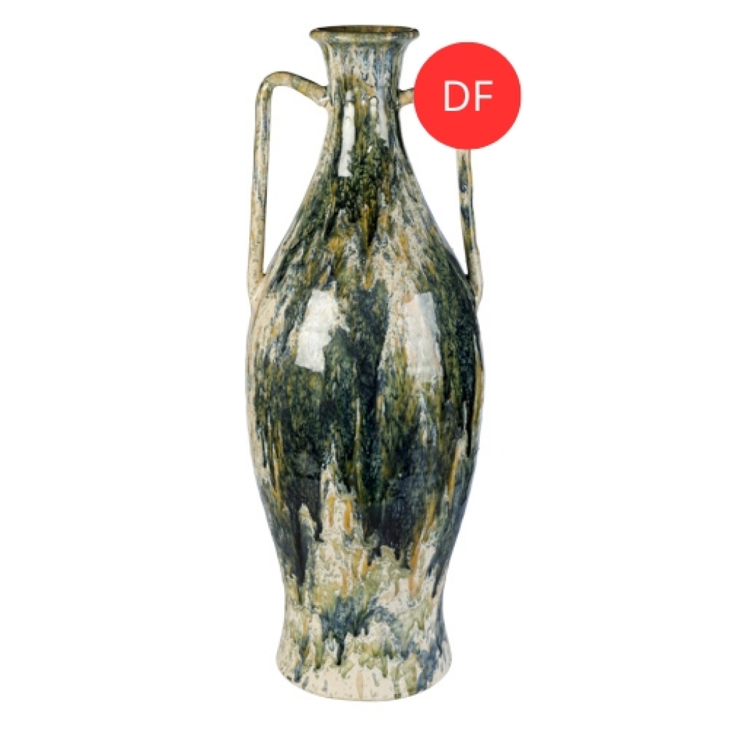 Ref: C10A04-876-1252 0Vaso alto, com detalhes marmorizado na cor marrom, azul de verde, de bocal afunilado com duas alcas