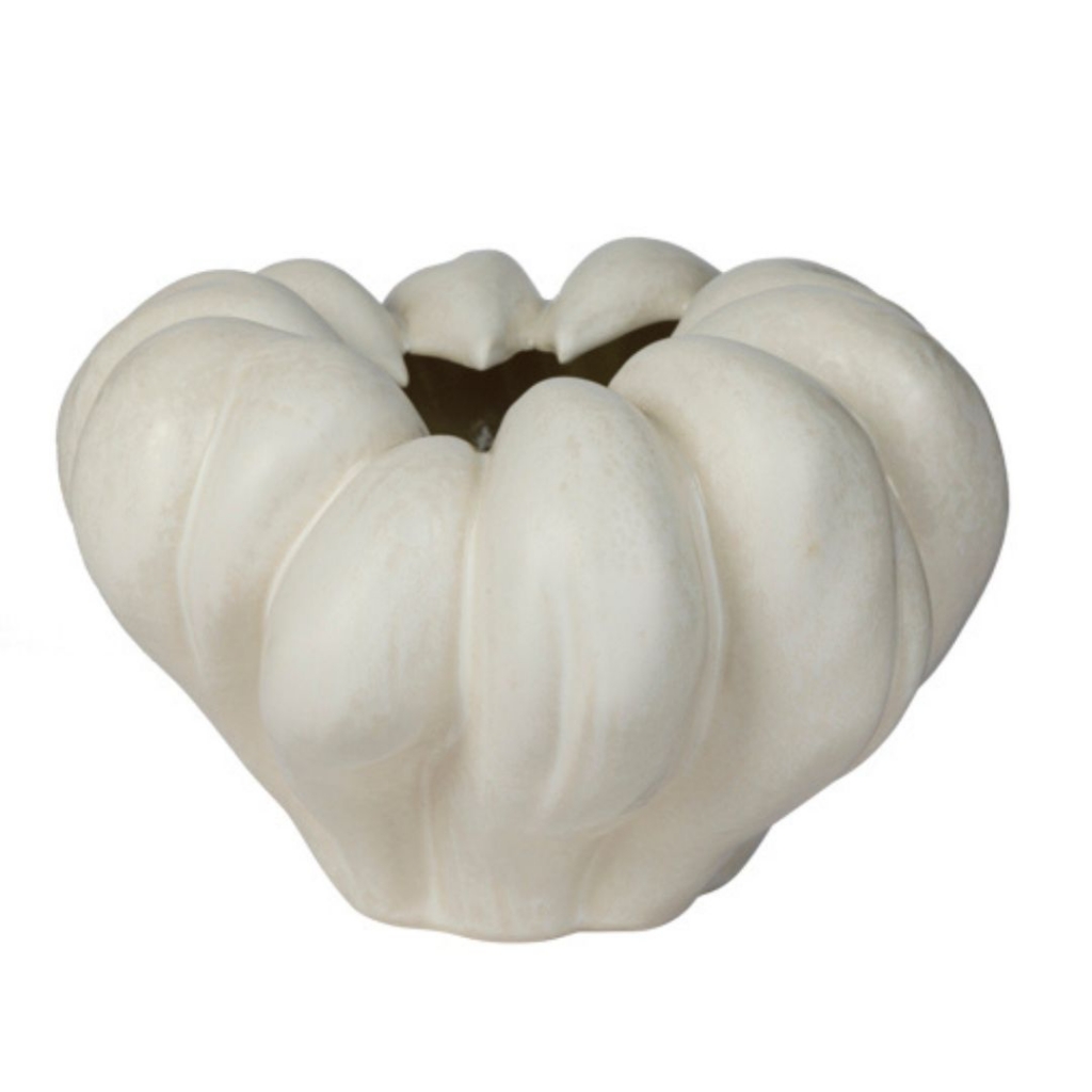 Ref: C30A04-010-1124 0Vaso pumpkin baixo de relevos 3D, com boca assimetrica, de cor branca brilhoso