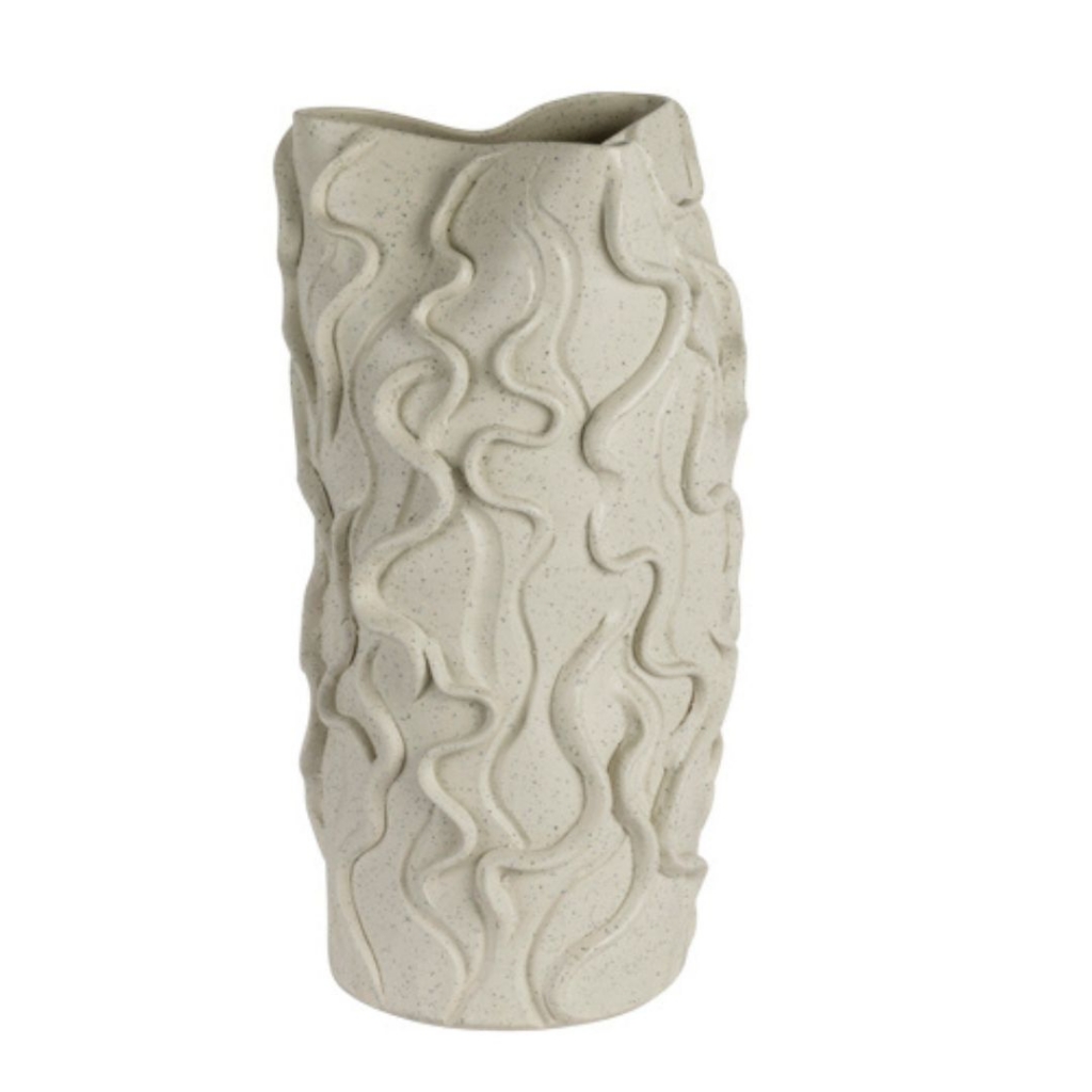 Ref: C50A01-002-1591 0VASO ALTO DE CERAMICA BRANCO, COM BORDA IRREGULAR E BASE COM DETALHES CURVADOS