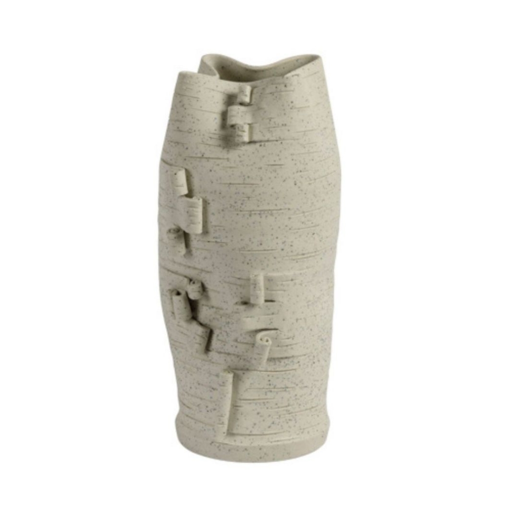 Ref: C50A01-003-1586 0VASO ALTO DE CERAMICA BRANCO, COM BORDA IRREGULAR E BASE AMASSADA COM ROLINHOS
